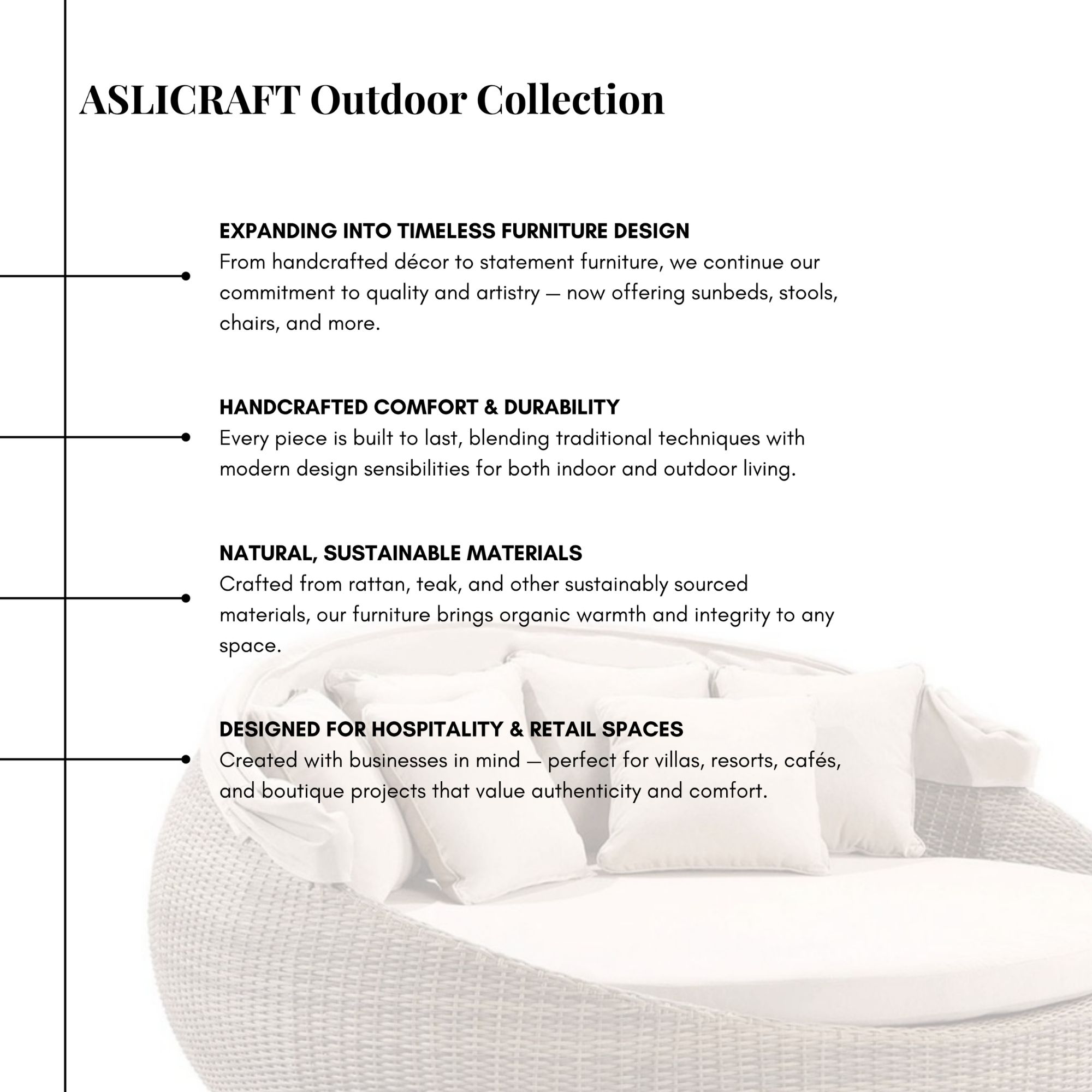 | Features | Handcrafted by skilled artisans in Indonesia Available in a variety of materials and finishes Weather-resistant and built for outdoor durability Elegant, comfortable design perfect for relaxation Ideal for resorts, villas, hotels, and outdoor projects Customization available for bulk and B2B wholesale orders |