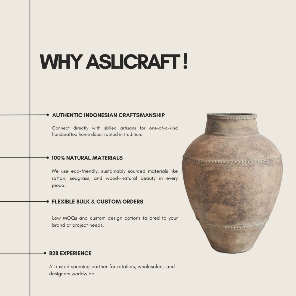 This handcrafted terracotta pottery piece is produced using high-quality natural clay and high-temperature firing to ensure durability, stability, and long-term performance. Its practical size makes it suitable for a wide range of applications, including residential décor, hospitality projects, retail collections, and commercial styling needs. Manufactured by skilled Indonesian artisans using traditional techniques, each unit features a natural textured finish, consistent rustic tones, and authentic handcrafted detailing. This product offers reliable quality for wholesalers, designers, and retailers seeking a versatile and premium handcrafted pottery item.