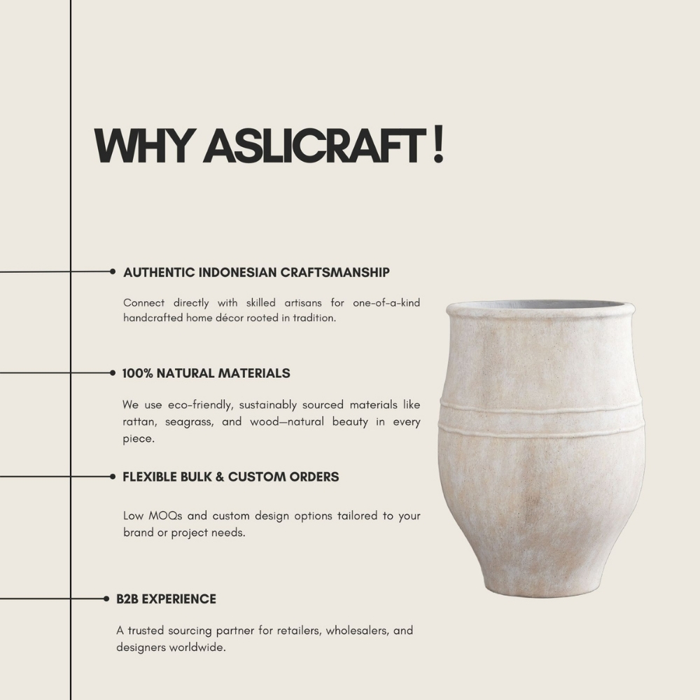 This handcrafted terracotta pottery piece is produced using high-quality natural clay and high-temperature firing to ensure durability, stability, and long-term performance. Its practical size makes it suitable for a wide range of applications, including residential décor, hospitality projects, retail collections, and commercial styling needs. Manufactured by skilled Indonesian artisans using traditional techniques, each unit features a natural textured finish, consistent rustic tones, and authentic handcrafted detailing. This product offers reliable quality for wholesalers, designers, and retailers seeking a versatile and premium handcrafted pottery item.