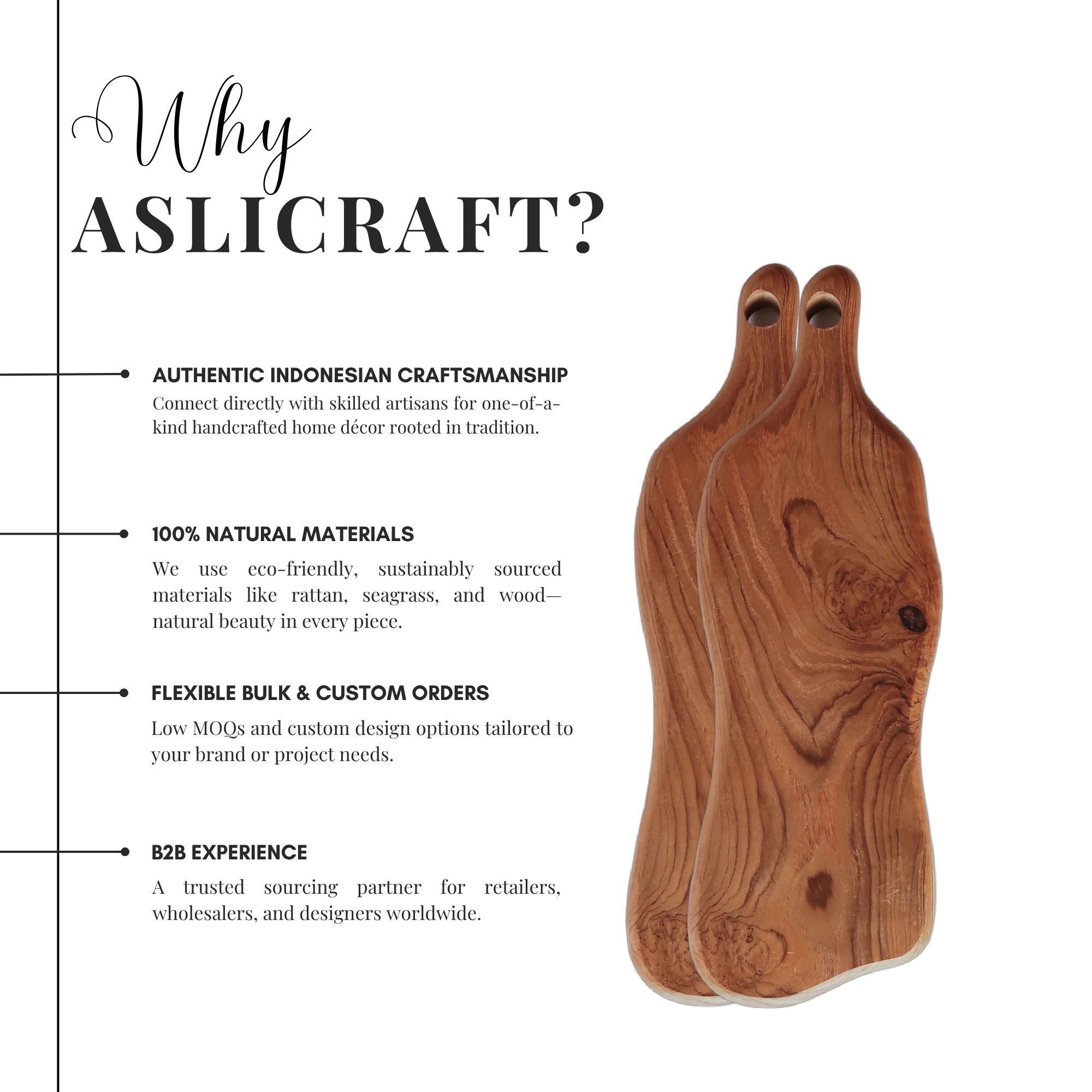 | Features | Handcrafted from durable, water-resistant teak wood with a smooth, food-safe surface. |