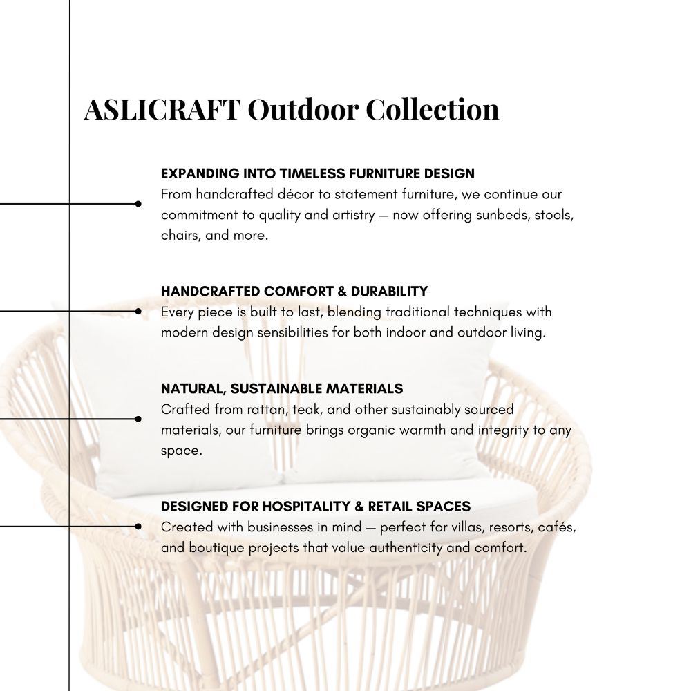 | Features | Handmade by experienced artisans in Indonesia Crafted from natural and eco-friendly materials Designed for durability and comfort Ideal for commercial or residential outdoor spaces Custom options available for sizes, materials, and finishes |