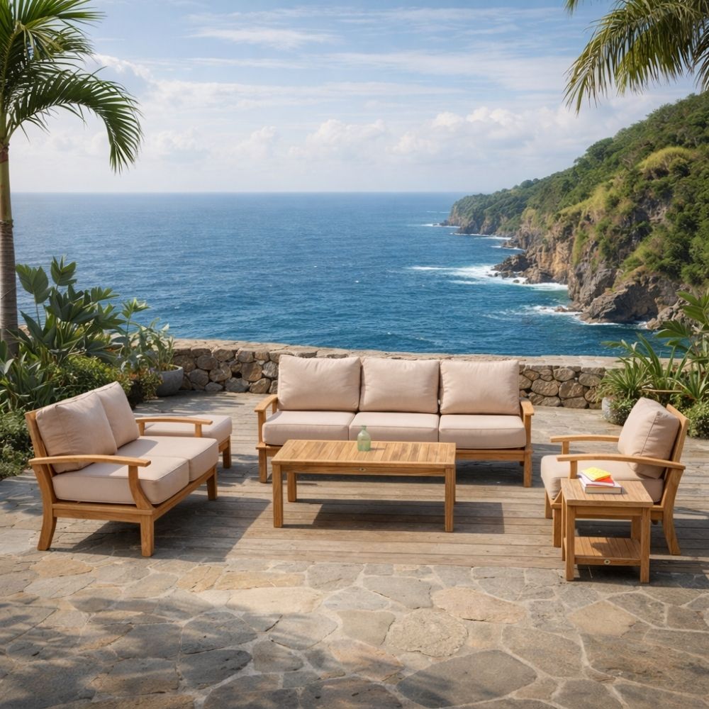 The Ombar Collection features premium outdoor furniture handcrafted from solid Grade A teakwood, designed to reflect the organic flow of ocean waves. The curved armrests and softened edges create a visual rhythm inspired by the sea, while maintaining strong structural support for long-lasting outdoor use. Paired with comfortable cushions and a warm natural teak finish, Ombar offers a balance between durability and relaxed elegance — ideal for villas, terraces, and resort environments.