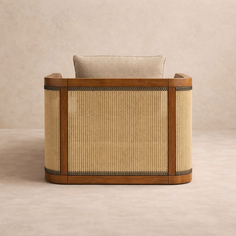The frame combines warm teakwood with handwoven rattan panels, creating a design that feels both grounded and light. The thick upholstered cushion provides exceptional comfort, while the supportive arm structure allows for relaxed lounging.