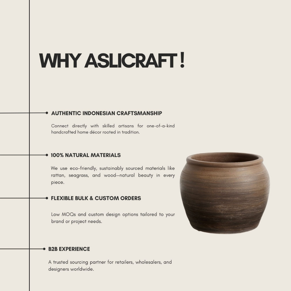This handcrafted terracotta pottery piece is produced using high-quality natural clay and high-temperature firing to ensure durability, stability, and long-term performance. Its practical size makes it suitable for a wide range of applications, including residential décor, hospitality projects, retail collections, and commercial styling needs. Manufactured by skilled Indonesian artisans using traditional techniques, each unit features a natural textured finish, consistent rustic tones, and authentic handcrafted detailing. This product offers reliable quality for wholesalers, designers, and retailers seeking a versatile and premium handcrafted pottery item.