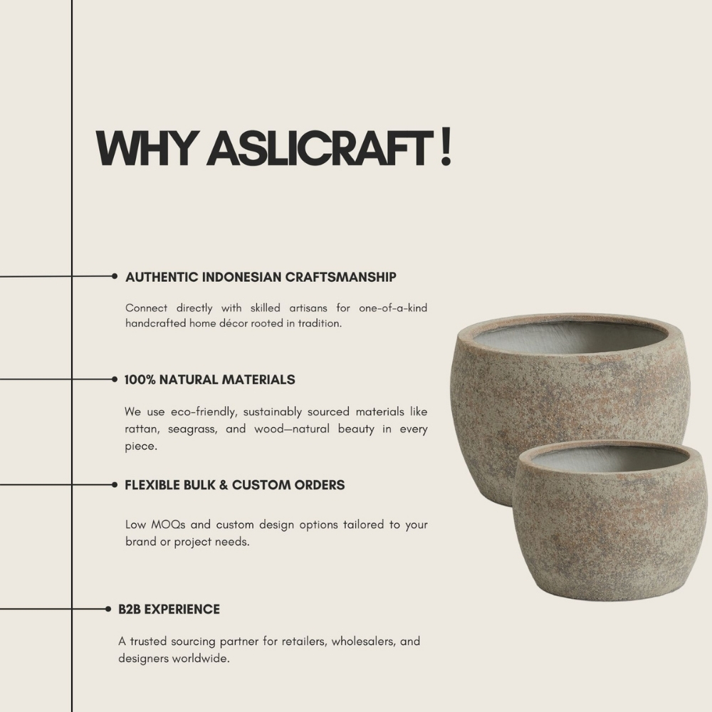 Bring Your Idea to Life! We collaborate with brands, designers, and retailers to craft exclusive, tailor-made terracotta planters. Whether it’s custom sizes, shapes, colors, or finishes, our skilled Indonesian artisans ensure premium craftsmanship and durable quality that reflects your brand’s unique style—all with the same minimum order. Let’s create something exceptional together!